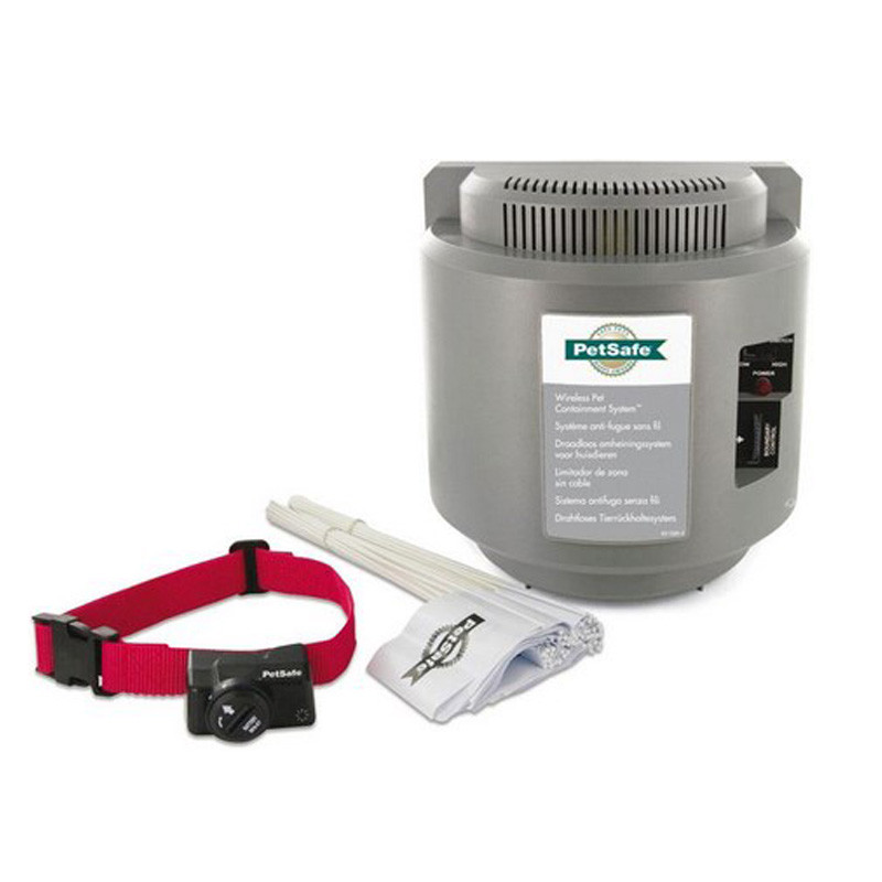 Valla antifuga inalámbrico a estimulaciones electrostáticas PETSAFE Wireless para perros, cubriendo un diámetro hasta 60m. Es fácil a colocar, no hay cable que debe enterrarse y pueden desplazarle según las necesidades.